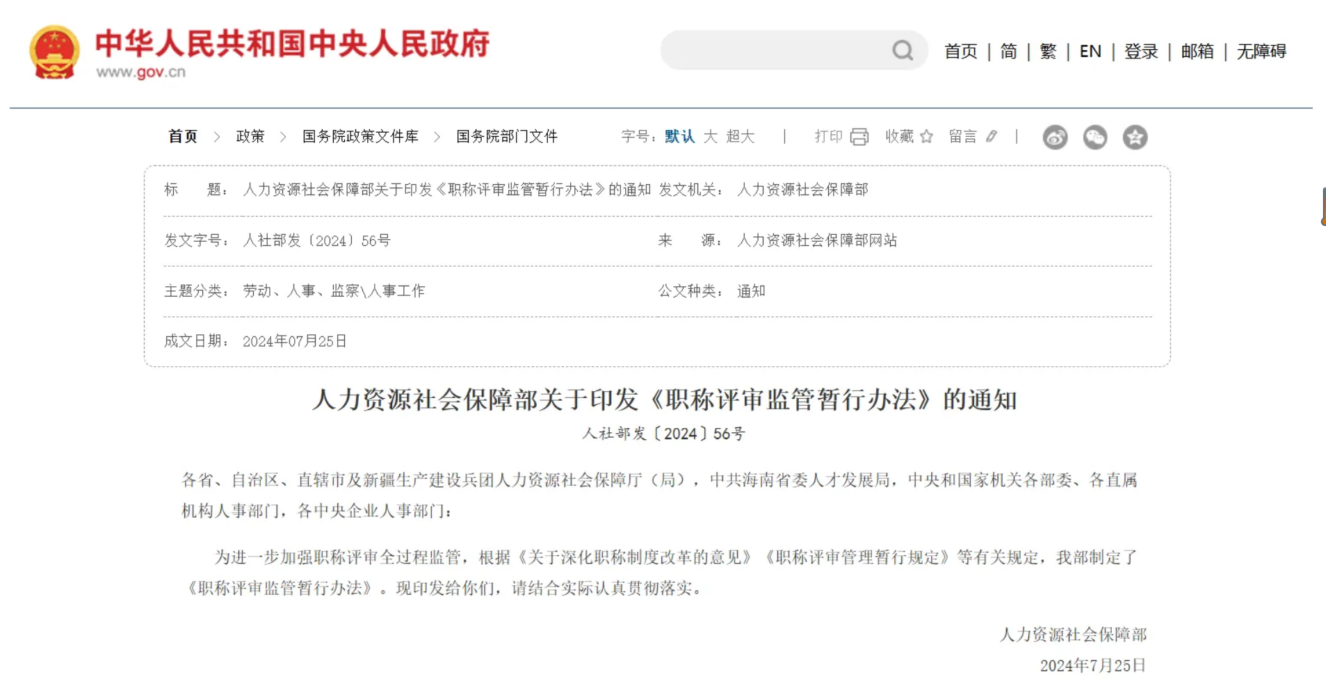 近日,人社部印發(fā)《職稱評(píng)審監(jiān)管暫行辦法》(人社部發(fā)〔2024〕56號(hào))?! ?、《辦法》有什么重要意義? 近年來(lái),在“破四唯”、“立新標(biāo)”、放權(quán)松綁...