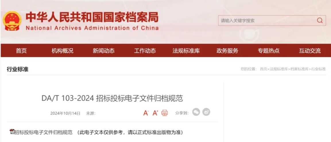 近日,國(guó)家檔案局發(fā)布《招標(biāo)投標(biāo)電子文件歸檔規(guī)范》行業(yè)標(biāo)準(zhǔn)?!墩袠?biāo)投標(biāo)電子文件歸檔規(guī)范》規(guī)定了招標(biāo)投標(biāo)交易平臺(tái)形成電子文件歸檔的一般方法,涵蓋了招標(biāo)投標(biāo)電子文件歸檔范...