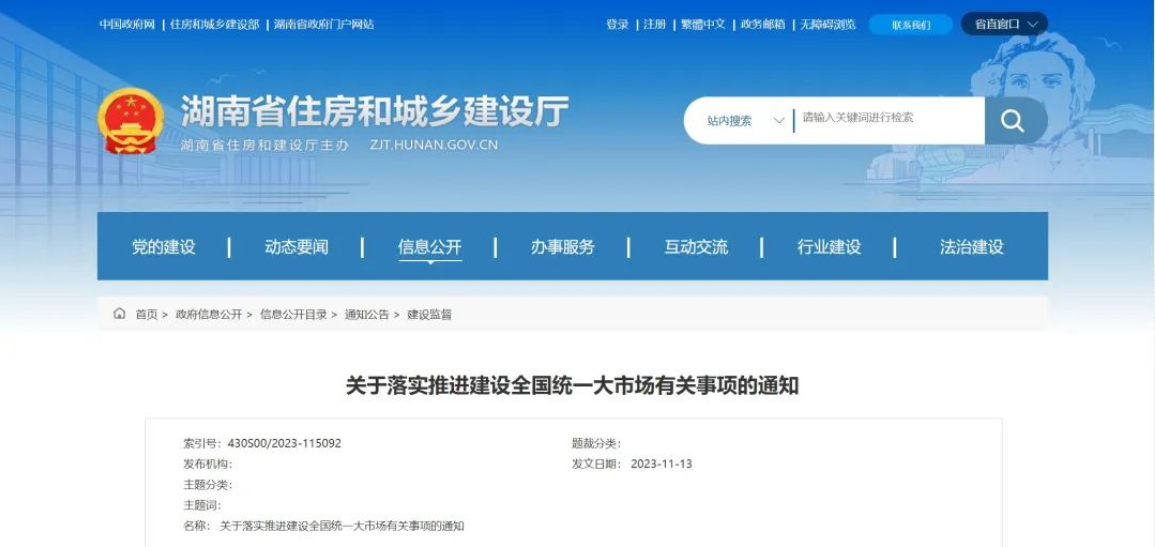 近日,湖南省住房和城鄉(xiāng)建設(shè)廳發(fā)布《湖南省住房和城鄉(xiāng)建設(shè)廳關(guān)于落實推進(jìn)建設(shè)全國統(tǒng)一大市場有關(guān)事項的通知》。