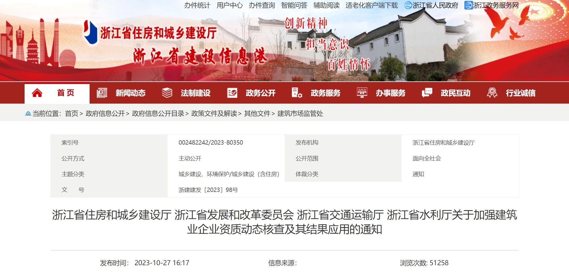 近日,浙江省住建廳聯(lián)合省發(fā)改委、浙江省交通運輸廳、浙江省水利廳等發(fā)布《關于加強建筑業(yè)企業(yè)資質(zhì)動態(tài)核查及其結果應用的通知》(以下簡稱《通知》)。決定自2023年11月15日起,在房屋建筑和市政工程、公路水運工程、...