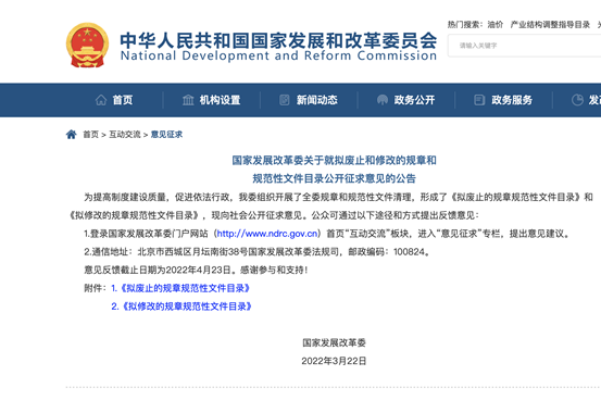 為提高制度建設(shè)質(zhì)量,促進(jìn)依法行政,近日,國(guó)家發(fā)展改革委發(fā)布《關(guān)于就擬廢止和修改的規(guī)章和規(guī)范性文件目錄公開(kāi)征求意見(jiàn)的公告》(以下簡(jiǎn)稱《征求意見(jiàn)》)。