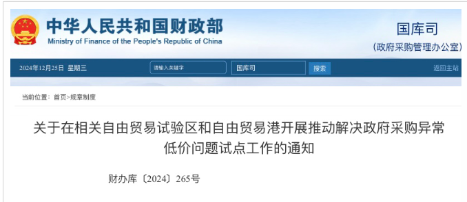 關(guān)于在相關(guān)自由貿(mào)易試驗(yàn)區(qū)和自由貿(mào)易港開(kāi)展推動(dòng)解決政府采購(gòu)異常低價(jià)問(wèn)題試點(diǎn)工作的通知財(cái)辦庫(kù)〔2024〕265號(hào) 北京市財(cái)政局、天津市財(cái)政局、上海市財(cái)政局、福建省財(cái)政廳、...