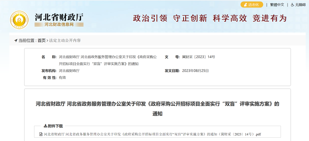 河北省政務(wù)服務(wù)管理辦公室發(fā)布關(guān)于印發(fā)《政府采購(gòu)公開(kāi)招標(biāo)項(xiàng)目全面實(shí)行“雙盲”評(píng)審實(shí)施方案》的通知!